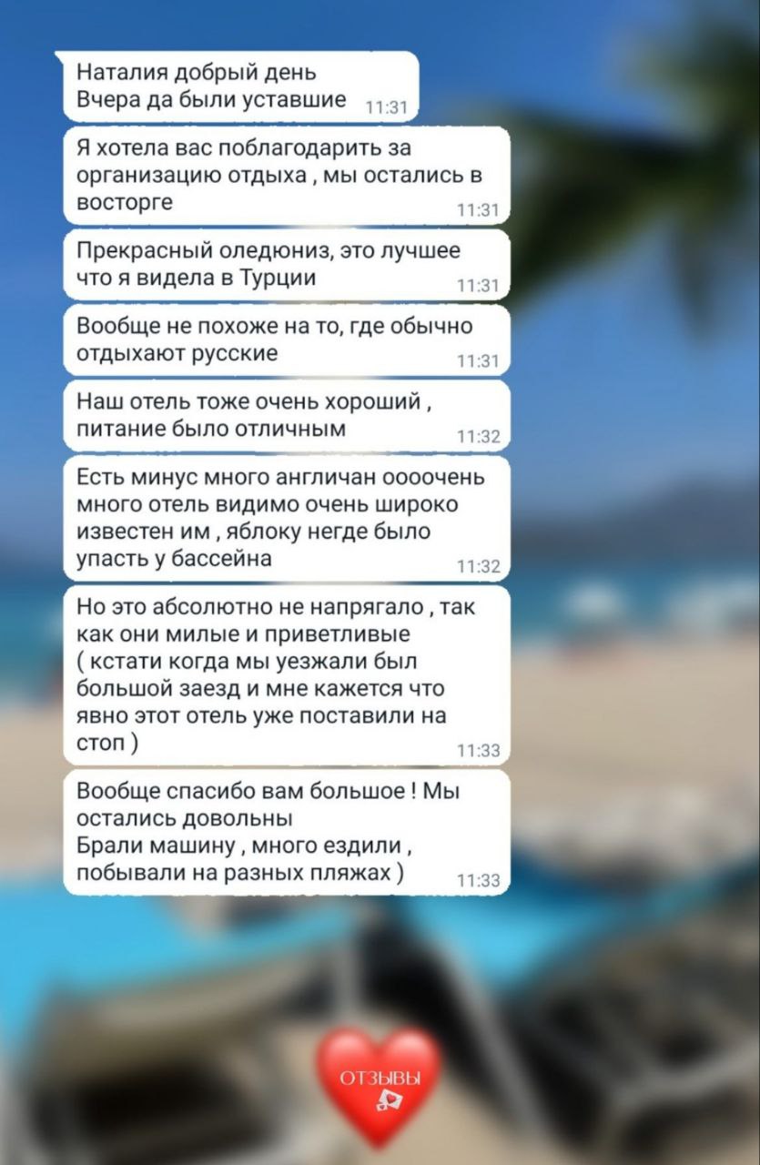 Мы с командой Travel-экспертов работаем с направлением Турция с 2018 года. Мы полюбили это направление всей душой и хотим, чтобы каждый из Вас побывал здесь, почувствовал ту непередаваемую атмосферу, за которой гости возвращаются сюда вновь и вновь.